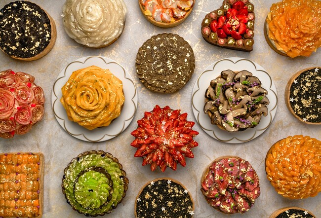 旬のフルーツをふんだんに使ったフルーツタルトと、キャビア・ウニ・トリュフなどの塩味タルトを展開。エディブルフラワーと金箔を散りばめたゴージャスな外観に心を奪われます。中身の構成もタルトによってそれぞれ異なり、ひとつひとつ手作りされたコンフィやクリームが幾重にも重なり、素晴らしいハーモニーを奏でており、驚きを覚えることでしょう。美しさも美味しさも、まさに世界の最先端レベルのタルトが日本で味わえることは、まさに食の新体験と言えるでしょう。