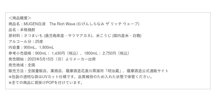 薩摩酒造株式会社 (代表取締役社長:本坊愛一郎、本社:鹿児島県枕崎市) は、薩摩酒造だけが使用できる果肉がオレンジ色のさつまいもの品種「サツマアカネ」とワイン酵母を使って濃密な甘い香りを引き出したプレミアム焼酎『MUGEN白波 The Rich Wave (むげんしらなみ ザ リッチ ウェーブ) 』(以下、MUGEN白波 TRW)を5月15日(月)よりメーカー出荷し、数量限定で新発売します。
