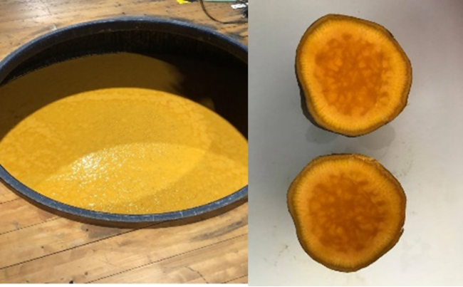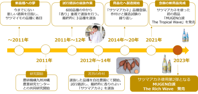 薩摩酒造は、本格焼酎の新しいフレーバーを生み出すために、2011年から原材料のさつまいもの研究開発に取り組んできました。約10年間で600品種を検証し、柑橘系と紅茶の香りを生み出すβ-カロテンが含まれる鮮やかなオレンジ色の「サツマアカネ」に辿り着きました。