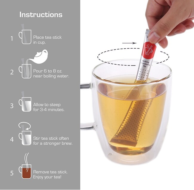 カップにお湯を注ぎ (適量:約250ml )、スティックを入れて2分ほど蒸らして軽く回せば出来上がり。高さが浅めのカップをお使いの場合は、最初にカップにスティックを差し込みお湯 (適量約250ml )をスティックの穴の上の方にかけながらお湯を注ぎます。どちらの抽出方法も、スティックの上の方の茶葉をしっかり抽出させることで最適な状態でティータイム楽しんでいただけます。また、約2分ほど蒸らしたら、カップに均一に味わいが広がるようにスティックをカップの中で軽く回すことをオススメします。