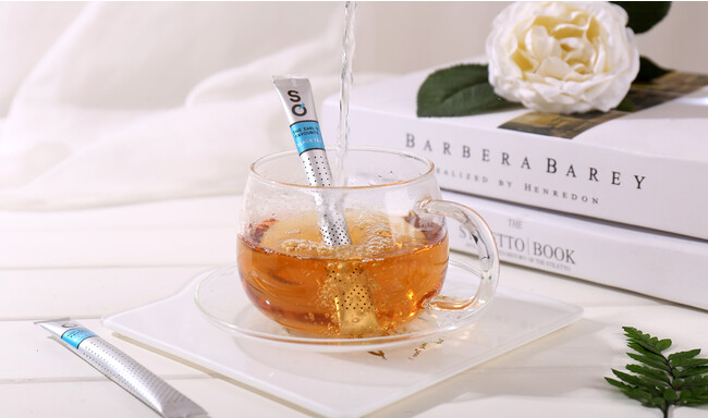 効率的に計算されたスティックには、0.08mmの細かい穴が400カ所以上空いており、茶葉が飛び出すことなく掻き回す遠心力により簡単に短時間で紅茶を淹れることができます。使い終わりも、カップからスティックを取り出してさっと水滴を振り落とせば、水滴が漏れることも少なく後片付けも簡単。スティックは1つ1つ個包装で、茶葉を包んでいるアルミスティックは衛生面にも配慮された滅菌アルミを使用しています。