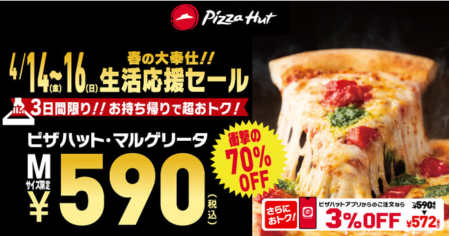 ピザハットは、皆様の春の新生活を後押しすべく「生活応援セール」を、2023年4月14日(金)~4月16日(日)で開催いたします。人気の定番メニュー「ピザハット・マルゲリータ」Mサイズが、通常価格1,990円→590円という70%OFFの衝撃価格でご提供!加えて、アプリからの注文でさらに3%OFFが適用され572円となるほか、様々な商品と交換ができる「スライス(ピザハットのポイント)」が、3スライスプレゼントされます!春を彩る超おトクなセールを是非ともお楽しみください!■セールの内容 店舗限定 お持ち帰りで「ピザハット・マルゲリータ(Mサイズ)」が590円となるセール■販売期間: 2023年4月14日(金)~2023年4月16日(日)■商品価格(税込): お持ち帰り Mサイズ:通常価格1,990円 → 590円(1,400円おトク!) お持ち帰り(アプリ注文) Mサイズ:通常価格1,990円 → 572円(1,418円おトク!)■注意事項:※一部店舗ではアプリ注文の割引率が異なります。※ピザはハンドトス生地Mサイズ限定です。※以下のURL記載店舗のみの実施となります。※追加トッピングは割引の対象外です。※他のクーポン、割引サービスとの併用はご容赦ください。※数量限定。店舗により販売を終了させていただく場合があります。「生活応援セール」の詳細はこちら→ https://www.pizzahut.jp/topic/margherita/takeout/?utm_source=pressrelease&utm_medium=prtimes&utm_campaign=seikatu590v2