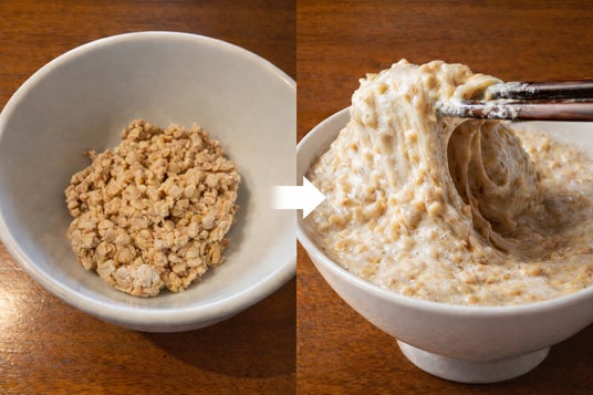 一般的に、ひきわり納豆は大豆を砕いて加工しますが、同社では大豆を刃で切るように割る新製法を採用。押しつぶすのではなく、繊維を意識しながら切り割ることで、大豆の状態や発酵後の質感に違いが生まれ、混ぜたときに空気を含みやすい、軽やかな口当たりにつながっています。