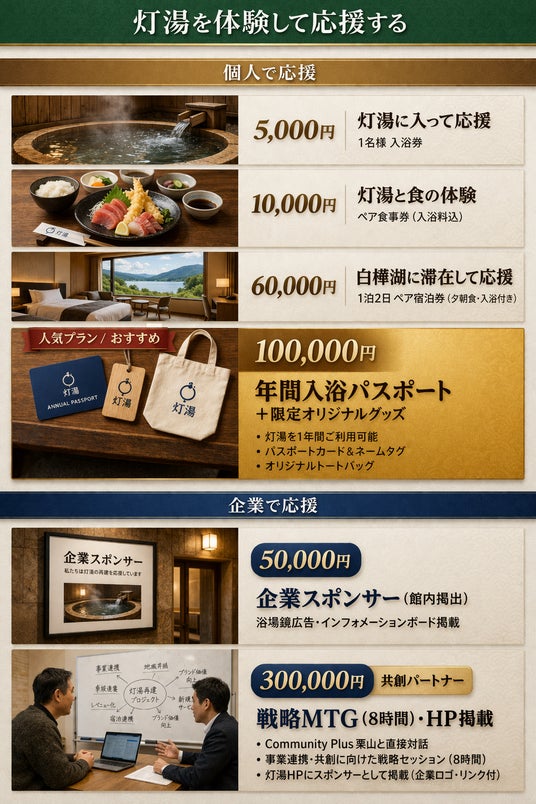 Community Plus株式会社(本社:東京都調布市、代表取締役:栗山友理)は、2024年に閉鎖された旧茅野市市営温泉「白樺湖温泉すずらんの湯」を、入浴・食事・集い・滞在の拠点「灯湯(あかりゆ)すずらん」として、2026年6月27日に再生・オープンいたします。