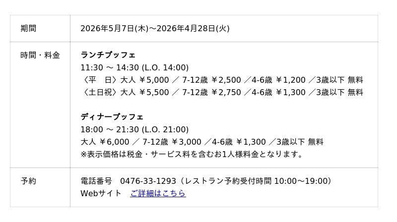ANAクラウンプラザホテル成田(成田市堀之内 総支配人 ダヴィデ・ザナルディ)では、5月7日(木)から6月30日(月)の2か月間限定で「Buono! イタリアーノ・ランチ&ディナーブッフェ」を 1F レストランカフェ「セレース」にて開催いたします。