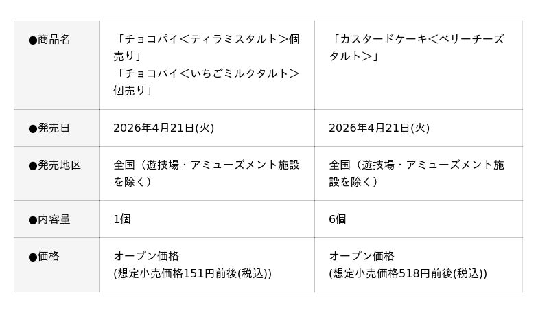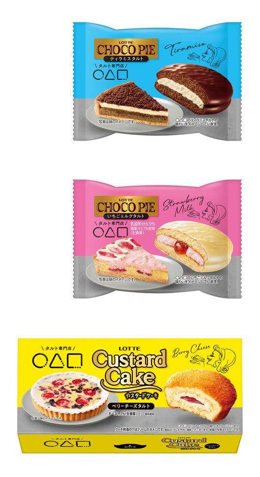 株式会社ロッテ(東京都新宿区、代表取締役社長執行役員:中島英樹、以下ロッテ)は人気タルト専門店の○△□(マルサンカクシカク)と初めてコラボレーションし「チョコパイ<ティラミスタルト>個売り」「チョコパイ<いちごミルクタルト>個売り」「カスタードケーキ<ベリーチーズタルト>」を2026年4月21日(火)に新発売します。