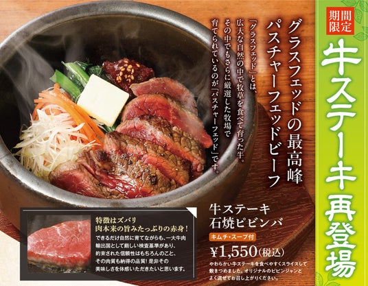 牛ステーキ石焼ピビンバ販売期間中限定で、薄切りしたパスチャーフェッドビーフを使用した贅沢なクッパとなっております。