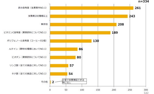 「『ゴールデンサジー(R)(GOLDEN SAJI(R)純正サジー果汁100%)』の魅力だと感じる点を教えてください。(複数回答可)」という質問には、「鉄分含有量(生果実内NO.1)」が最も高く、続いて「栄養素200種類以上」「無添加」という回答を管理栄養士からいただきました。