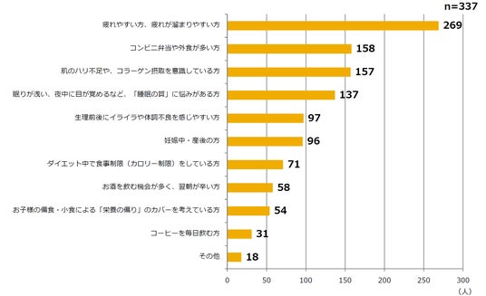 「栄養成分をご確認いただき、どのような方におすすめしたいですか?(複数回答可)」という質問に対して管理栄養士の回答は「疲れやすい方、疲れがたまりやすい方」が最も高く、次に「コンビニ弁当や外食が多い方」「肌のハリ不足や、コラーゲン摂取を意識している方」におすすめしたいという結果となりました。