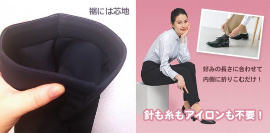 「ロールイン・パンツ(R)」は、裾に4cmまたは5cm幅の芯を貼ることで、内側に折り返すだけで丈を固定できるボトムスです。