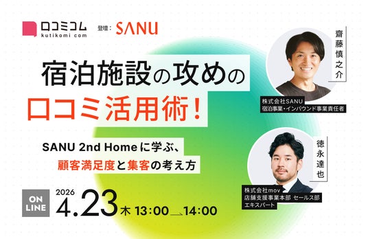 本セミナーでは、セカンドホームサービスを展開する株式会社SANUの齋藤氏をお招きし、口コミを「顧客との対話」や「未来のゲストへのFAQ」として捉え、施設改善・顧客体験向上・集客最大化につなげる実践事例をご紹介します。