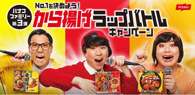 人気お笑いトリオ「ハナコ」が、昨年春・秋に続き三たびニッスイの冷凍から揚げのPRに登場します。ラップのオリジナルユニットに扮して、思わず食べたくなるようなから揚げのおいしさを伝えるラップバトルのムービーをキャンペーンサイトで展開します。