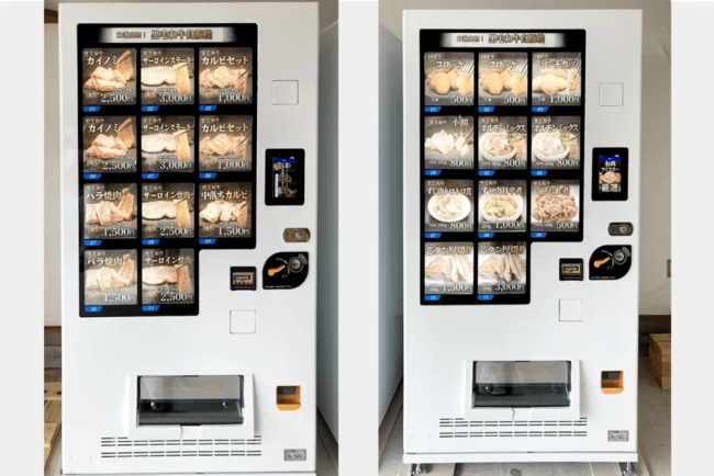 今回は食肉(A5ランクの??和牛)やホルモン、牛すじカレーなどの加工食品を無人で販売したいというご要望があり、自動販売機型の無人店舗として弊社から冷凍自動販売機「SD-11DVM(ど冷えもん)」を2台導入させて頂きました。