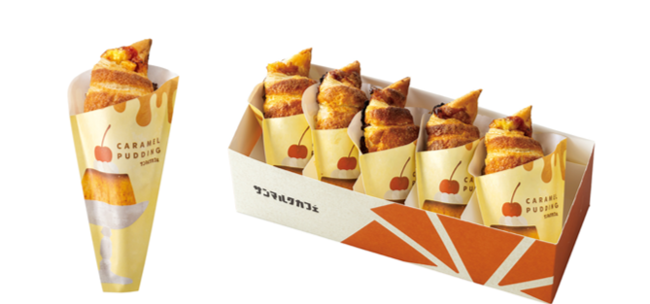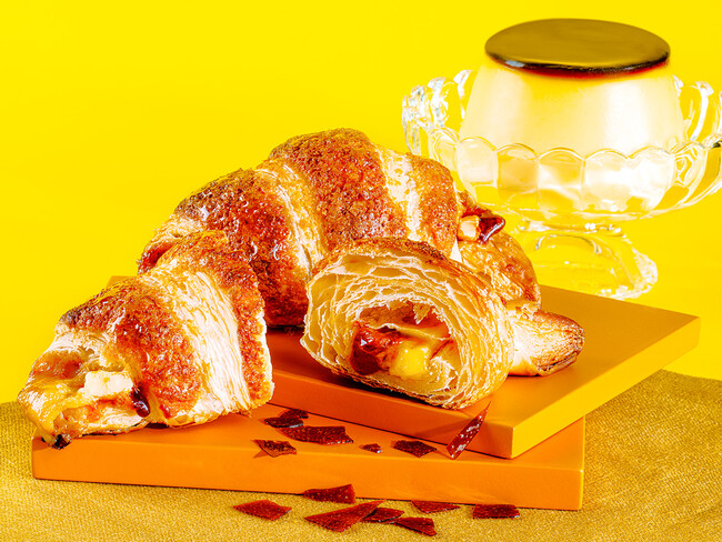 「プリン」に着目し、今回のために開発したプリン風味のチョコレートを、サクサクのクロワッサン生地で包み込みました。更にカスタード、キャラメルシュガーを加え、味わいだけでなく、中からじゅわっと溢れる なめらかな食感や香りもカラメルプリンに近づけました。上部にはカラメルソースとサクサク食感のアーモンド生地を絞り、キャラメルシュガーをかけて焼き上げることで、焦がしカラメルのような深い味わいとパリッとした食感をお楽しみいただけます。