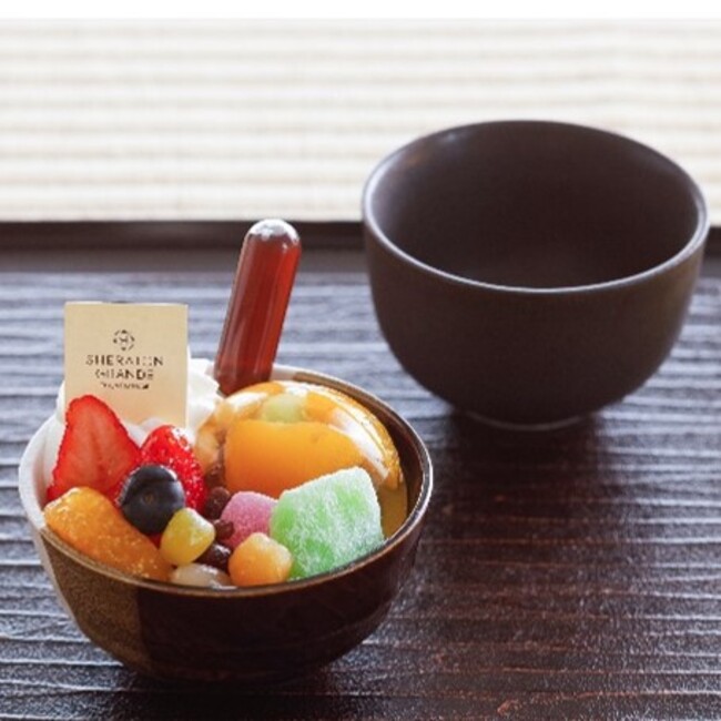 風情ある陶器の器が印象的な、プリンとあんみつを一度に味わえる新感覚の和洋折衷スイーツです。あずき入りの抹茶プリンの上に、あんみつ玉や色鮮やかな求肥、いちご、みかんなどをたっぷりのせた、彩り豊かな一品です。お好みで黒蜜をかけてお楽しみください。