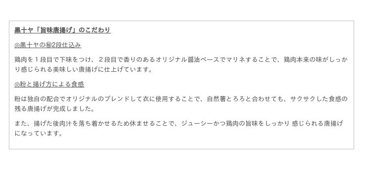 「黒十ヤ」では、様々な季節の旬の食材を繊細に調理する和食の姿勢に倣い、 食材、お客様のお声、コロナ禍も含めた環境にも対応していくことで、決して「これで良し」 と満足せず改良しつづけている旨味唐揚げと稀少な自然薯を使ったとろろが絶妙なマッチングの『自然薯とろろ丼』をメインに、おつまみやテイクアウトにもぴったりな旨味唐揚げ単品、自然薯とろろご飯と一緒に味わう唐揚げ定食(店舗限定)などで金賞の味をお楽しみいただけます。