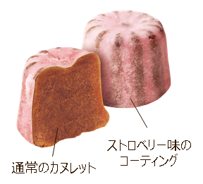カヌレ専門店ではカヌレの上に様々なコーティングやトッピングをすることで味展開を行っているお店が多くみられます。そこで、通常の「カヌレット」にストロベリー味のコーティングをし、専門店と同じ製法で仕上げを施しました。本格的なシリーズ展開の「カヌレット ストロベリー」をお楽しみ下さい。