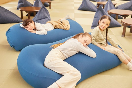 「わらうんじ」の中心となる最も広い空間が、畳の上でゆったりとくつろげる「凪(NAGI)」チルルームです。木のぬくもりに包まれた空間には、テーブルと椅子、座卓とビーズクッション、寝転がって過ごせるビッグクッションなど、多様なスタイルに応じて使い分けられるアイテムを配しました。