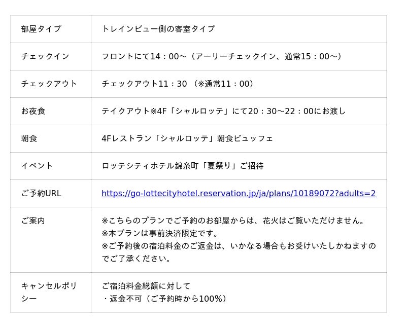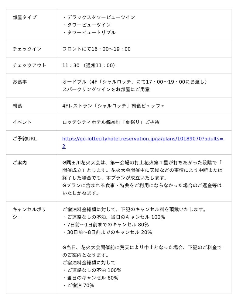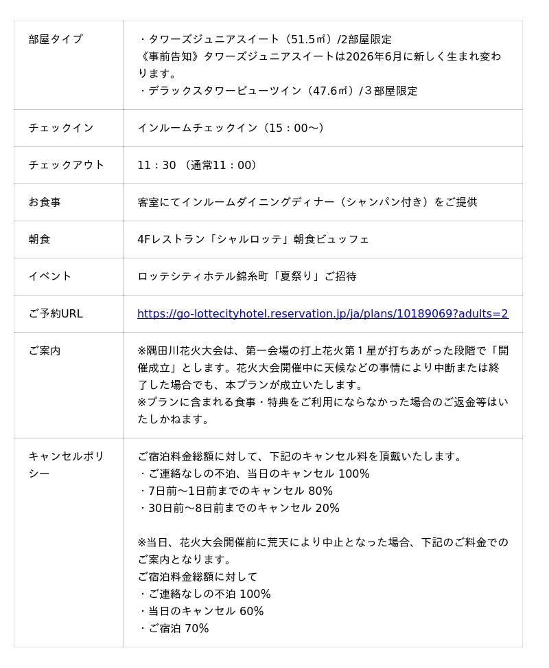 ロッテシティホテル錦?町(所在地:東京都墨田区錦?4-6-1、総支配人:福井朋也)は、2026年7月25日(土)に開催される「第49回隅田川花火大会」に合わせ、夏の風物詩をご堪能いただける一夜限定特別宿泊プラン3種を、4月16日(木)12時より販売開始いたします。東京の夏を象徴する特別な一日を、ロッテシティホテル錦糸町でぜひお楽しみください。
