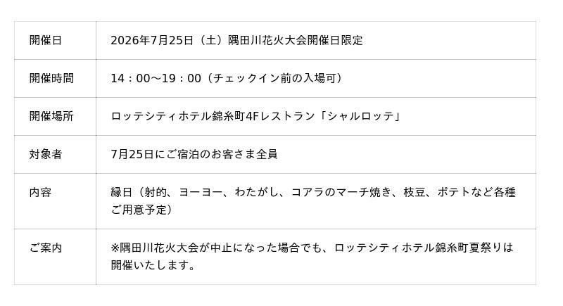 毎年ご好評をいただいているロッテシティホテル錦糸町「夏祭り」を、本年も開催いたします。ご宿泊のお客さま限定でご参加いただける、花火大会前の特別なひとときをお届けいたします。縁日や「コアラのマーチ焼き」、ドリンクなどをご用意し、どこか懐かしさを感じる夏祭りをご提供。花火の打ち上げを待つ時間も、心弾む思い出へと演出いたします。