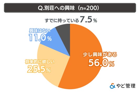 別荘への興味を聞いたところ、「少し興味がある」が56.0%、「将来的に欲しい」が25.5%と、合わせて81.5%が別荘に関心を持っていることがわかりました。