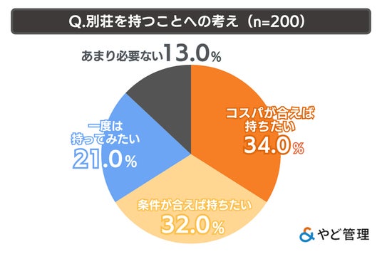 別荘を持つことへの考えとしては、「コスパが合えば持ちたい」が34.0%で最多となり、「条件が合えば持ちたい」32.0%、「一度は持ってみたい」21.0%と続きました。「あまり必要ない」はわずか13.0%と回答者の9割近くが別荘を持つことへの関心がありました。