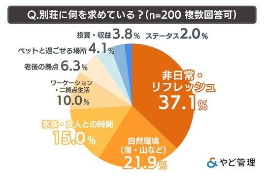 別荘に求めるものを複数回答で聞いたところ、「非日常・リフレッシュ」が37.1%(構成比)で圧倒的な1位となりました。次いで「自然環境(海・山など)」21.9%、「家族・友人との時間」15.0%と続き、投資目的(3.8%)やステータス(2.0%)を大きく上回りました。別荘に対して、資産価値よりも体験・時間の質を求める傾向が鮮明になっています。