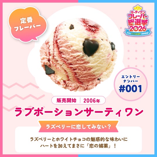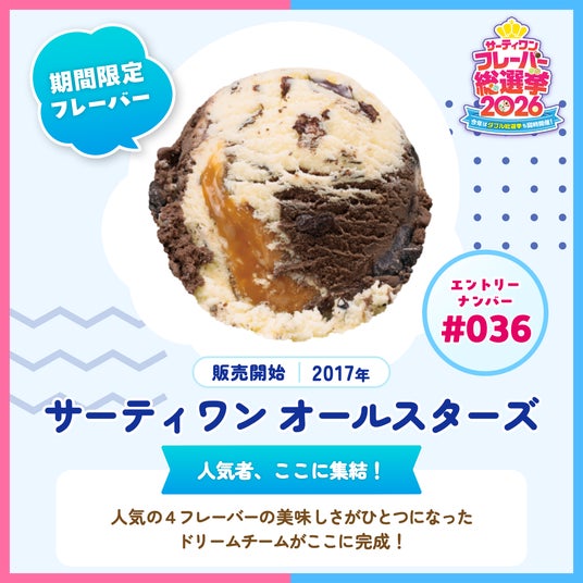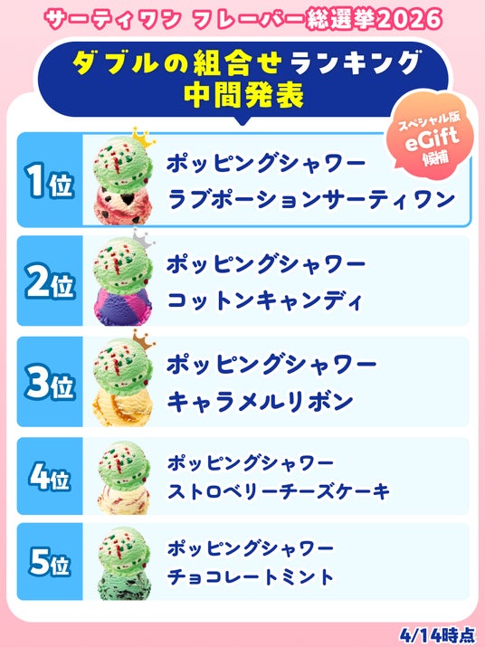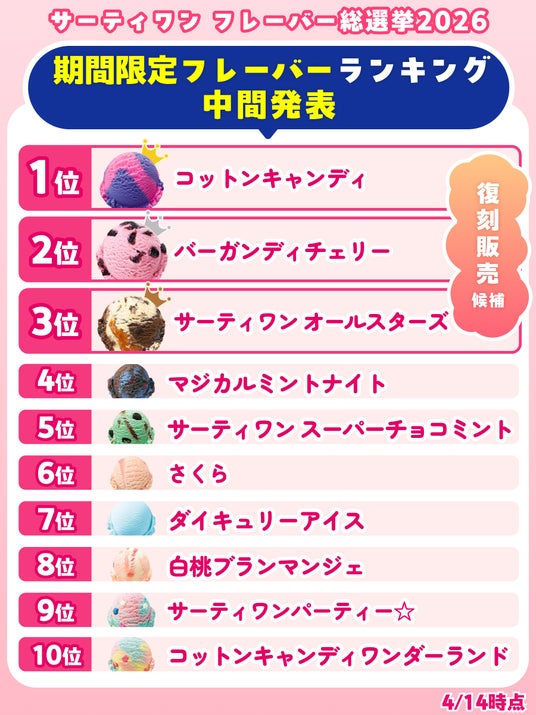 B-R サーティワン アイスクリーム株式会社(所在:東京都品川区上大崎3-1-1/代表取締役会長兼社長 CEO ジョン・キム:東京証券取引所(スタンダード市場):2268)は、「サーティワン フレーバー総選挙2026」を開催しています。これまで開発してきた1,400種類のオリジナルフレーバーの中から、珠玉の100種がエントリーし、昨年を上回る投票ペースで大きな盛り上がりを見せています。4/14(火)時点の暫定順位は下記の通りです。