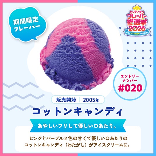 復刻販売をかけた期間限定フレーバーランキングでは、1位コットンキャンディ、2位バーガンディチェリーと続き、サーティワン オールスターズが前回の9位から躍進し上位3位にランクイン。前回、前々回の総選挙では、1位バーガンディチェリー、2位コットンキャンディという結果でしたが、今回はコットンキャンディがついに初のNo.1に輝くのか注目が集まります。