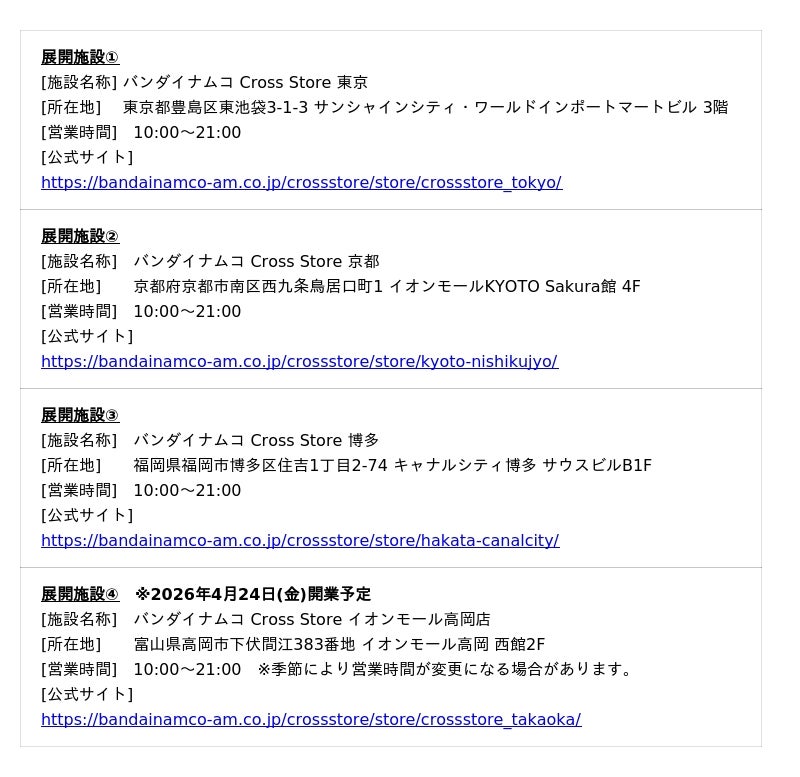 ※「バンダイナムコ Cross Store」は、バンダイナムコグループ各社が展開しているキャラクター、商品などを「観る」「触れる」「体験する」ことができるリアルタッチポイントとして、さまざまなコンテンツとお客さまが施設を通じてクロスして生まれる新たなエンターテインメント体験を提供しています。2022年7月に横浜・博多にオープンして以来、国内12店舗、海外に3店舗を展開しています。