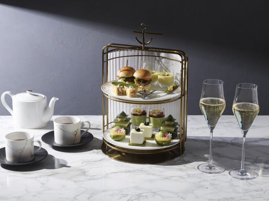 また今回、開業以来使用している港町・横浜をイメージした錨型のアフタヌーンティースタンドに加え、新たにガラスウェアを採用。透明感のあるプレートが、初夏らしい爽やかな抹茶デザートの彩りを一層引き立てます。