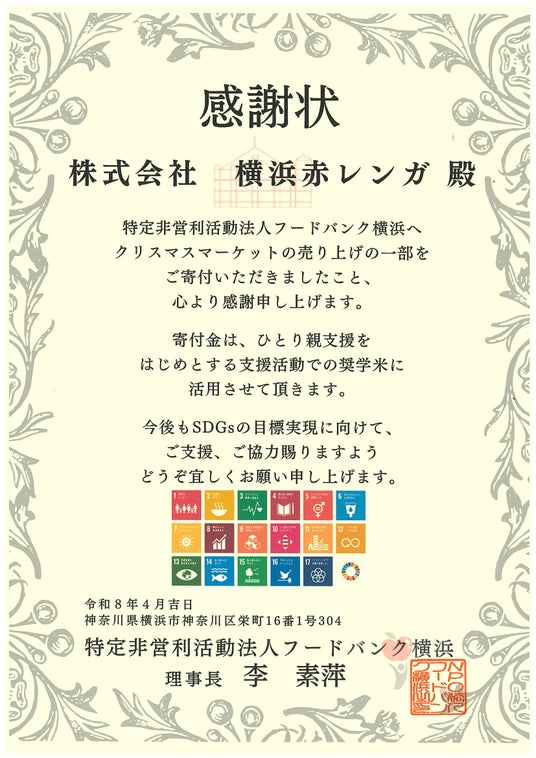 株式会社横浜赤レンガ(本社:横浜市、代表取締役 岩崎求起(以下、当社))は、SDGsの取組「笑う、サステナブル」活動の一環として、「Christmas Market in 横浜赤レンガ倉庫」にて限定販売したオリジナルマグカップの売り上げの一部を、特定非営利活動法人フードバンク横浜(以下、フードバンク横浜)へ寄付しました。