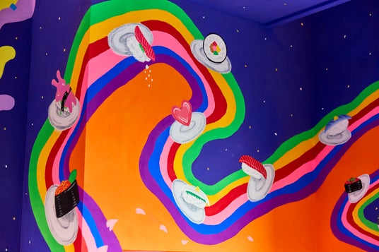 The rainbow that circles the entire room represents the kaiten-zushi lane.