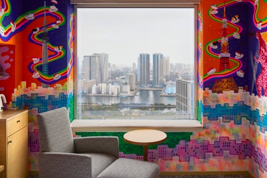 Interior artwork and the view of Hama-rikyu Gardens converge