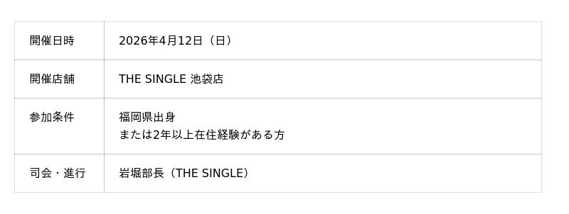 2026年4月12日(日)、THE SINGLE池袋店にて「福岡県出身・在住経験者限定 恋活交流会」を開催しました。司会・進行は岩堀部長が担当。初の試みとあって、スタッフ側も当日の展開を見守る緊張感があったといいます。前半:グループ交流タイム