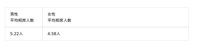 3月のデータを見ると、1回のご来店で相席した人数の平均は男性5.22人、女性4.58人でした。特別なことをしなくても、ご来店いただくだけでこれだけの方と実際に顔を合わせてお話しいただけるのが、このサービスの特徴です。