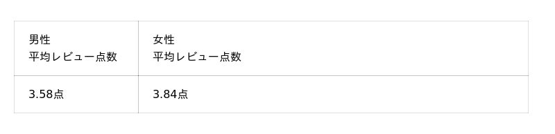 ◆ 平均レビュー点数は男性3.58点、女性3.84点(5点満点)