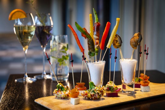 (各ホテルならではのウェルカムドリンクと、犬山城下町らしい串グルメ仕立てのウェルカム串でお迎えします)