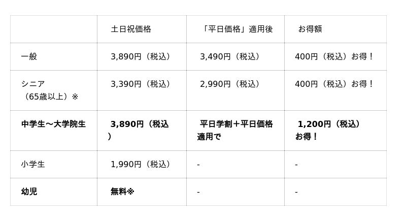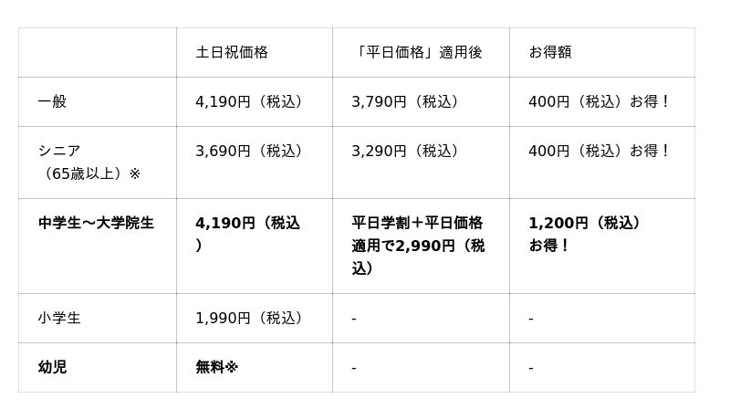 ●「平日学割」は学生証ご提示の本人に限り有効です。「平日価格」・「平日学割」はキャンペーン開催期間中の土日・祝を除く平日のみが割引適用となります。「平日価格」の対象は一般・シニア料金のお客様です。