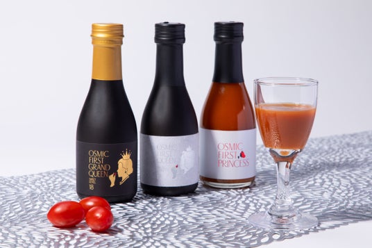 フルーツジュースが嫉妬する、甘美な味わい。〈OSMIC FIRST〉の高糖度フルーツミニトマトだけを使用し、添加物・塩・砂糖はもちろんのこと、水一滴さえ加えずに仕上げたフルーツトマトジュースです。皮や種ごと煮詰めた後、丁寧にうらごしすることで不要な部分を取り除き、なめらかな口当たりへと仕上げています。三つの個性を飲み比べることで、トマトジュースの新しい魅力に出会える特別なセットです。