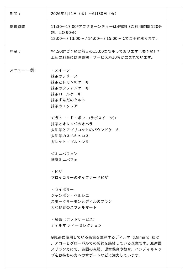 新緑から初夏へと移ろう季節に、奈良の食文化を代表する抹茶をテーマに、宇治抹茶や大和茶を使用したスイーツと奈良の食材を取り入れたセイボリーを組み合わせた特別な内容です。