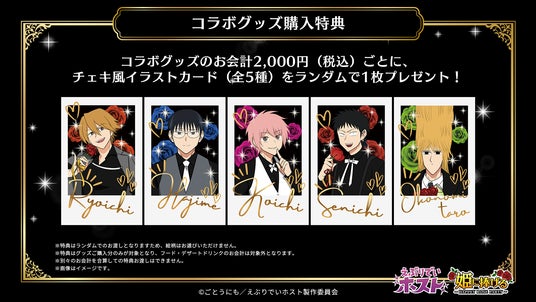 コラボグッズのお会計2,000円(税込)ごとに、「チェキ風イラストカード(全5種)」をランダムで1枚差し上げます。