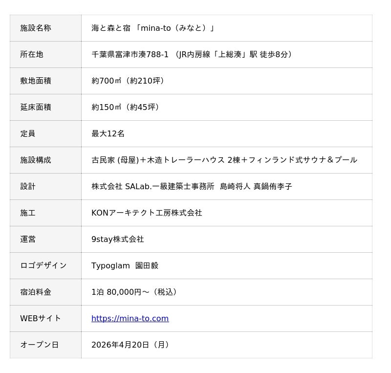 つくる地所株式会社(本社:東京都港区)は、千葉県富津市湊に一棟貸し別荘「海と森と宿 mina-to(みなと)」を2026年4月20日(月)にグランドオープンいたします。東京から車で約90分、JR内房線「上総湊」駅から徒歩約8分。海と森に囲まれた静かな環境で、最大12名でご利用いただける一棟貸しの宿泊施設です。