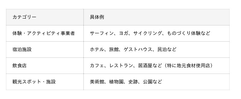 AOSHIMA DISCOVERY TOURSでは、青島の「新しい発見」を一緒に作っていただける体験プログラム、宿泊施設、飲食店、観光スポットを随時募集しています。当サイトに掲載することで、旅行関心層へのダイレクトなアピールや、エリア全体の回遊性向上、ブランドイメージの向上といったメリットが期待できます。あなたのビジネスや活動を、より多くの旅行者に届けるお手伝いをさせてください。今後も掲載パートナーを順次追加していく予定です。募集対象カテゴリー