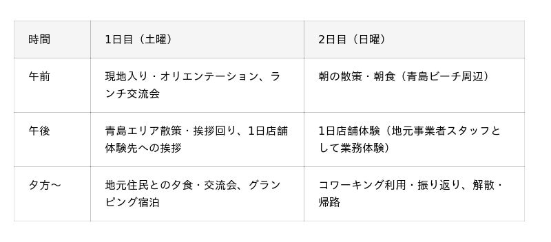 住んで、働いて、遊んで。「いつか」を「いま」試せる個人向けプランです。お迎えから見送りまで、現地住民が2日間アテンドして青島をご案内。地元事業者での「1日店舗体験」を通して、観光や移住では体験できない、地域と多様なかたちで継続的に関わる機会を提供します。・当選枠:2組・無償提供:AOSHIMA PICNIC CLUB グランピング宿泊(1泊)・実費負担:飲食費・旅費交通費スケジュール概要(2日間)