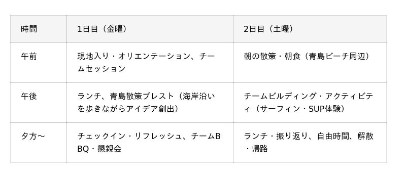 いつもできないことを、青島なら。チームの仲を深める法人向けプランです。AOSHIMA PICNIC CLUBのコワーキングスペースやグランピング施設を拠点に、自然豊かな青島の環境を活かした2日間のオフサイトプログラムを提供します。集中したチームセッションや、海岸沿いの散策を取り入れたブレインストーミング、チームBBQなどを通じて、日常業務では得られない発想の創出とチームビルディングを促進します。