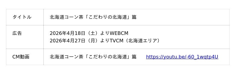 サッポロホールディングス(株)のグループ企業である、ポッカサッポロフード&ビバレッジ株式会社(代表取締役社長:佐藤雅志、本社:愛知県名古屋市)は、「北海道コーン茶」の新たなイメージキャラクターとして俳優の夏帆さんを起用し、新CM「こだわりの北海道」篇を2026年4月18日(土)よりWEBで、4月27日(月)より北海道エリアでTV放送を開始します。