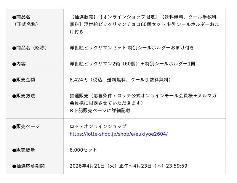 株式会社ロッテ(東京都新宿区、代表取締役社長執行役員:中島英樹、以下ロッテ)は、2026年4月21日(火)正午~4月23日(木)23:59:59の期間にて、「浮世絵ビックリマンチョコセット 特別シールホルダーおまけ付き」を抽選販売いたします。ロッテオンラインショップ限定・6,000セットの数量限定です。