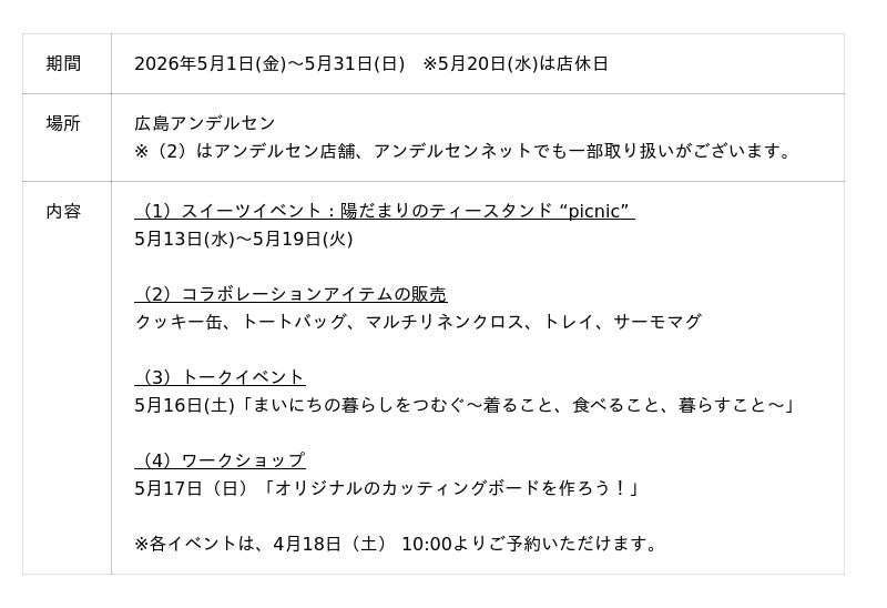 株式会社アンデルセン(本社:広島市中区鶴見町2-19、代表取締役 社長執行役員:松本 真一)は、株式会社ミナ、株式会社マルニ木工との初めてのコラボレーション企画を、2026年5月1日(金)から5月31日(日)まで広島アンデルセン(広島市中区本通7-1)にて開催いたします。