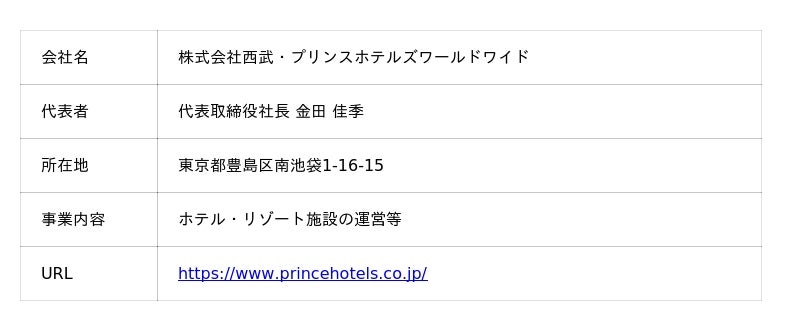 株式会社西武・プリンスホテルズワールドワイド西武グループの中核企業として、国内外に90以上のホテル、ゴルフ場、スキー場などのレジャー施設を運営。「プリンスホテル」ブランドをはじめ、多様なブランド展開により、あらゆるお客さまのニーズにお応えするホスピタリティ企業です。日本のホテル業界を牽引するリーダーとして、伝統と革新を融合させたサービスを提供し続けています。